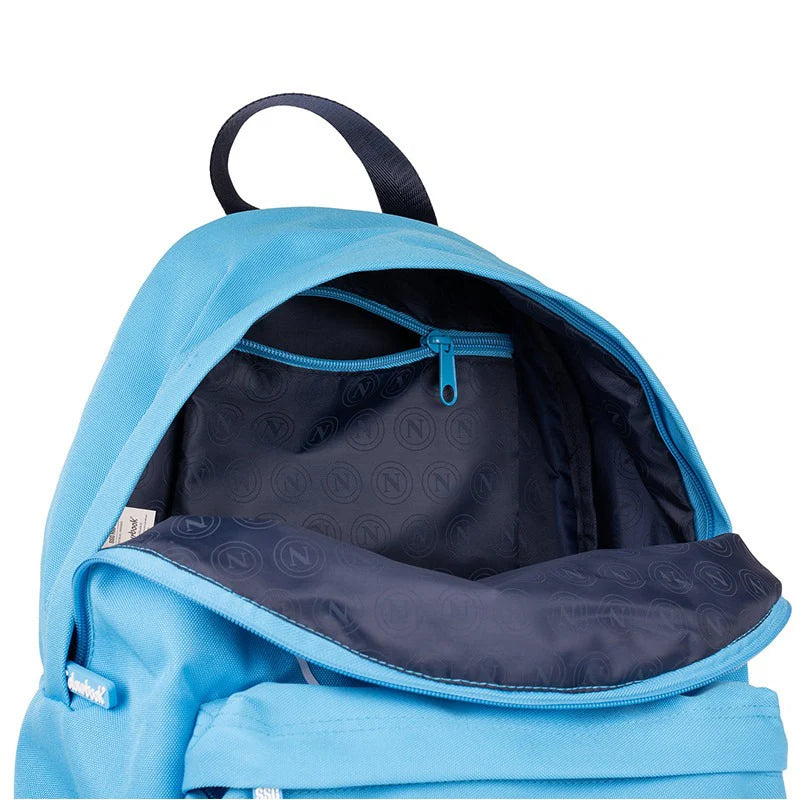 SSC Napoli zaino tempo libero in stoffa con spallacci imbottiti regolabili, capiente tasca anteriore per la minuteria. Logo SSC Napoli spessorato.